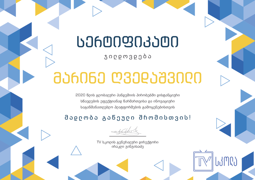 დისტანციურ სწავლებასთან დაკავშირებით მრავალი ახალი რესურსი დაიდო ონლაინ სივრცეში, მათ შორის მინდა ავღნიშნო საინტერესო და პრაქტიკულად გამოსაყენებელი, მართლაც საუკეთესო - tvschool.ge, მოსახმარებლად მარტივი და დავალებების მისაცემად საკმაოდ დიდი ბაზა.