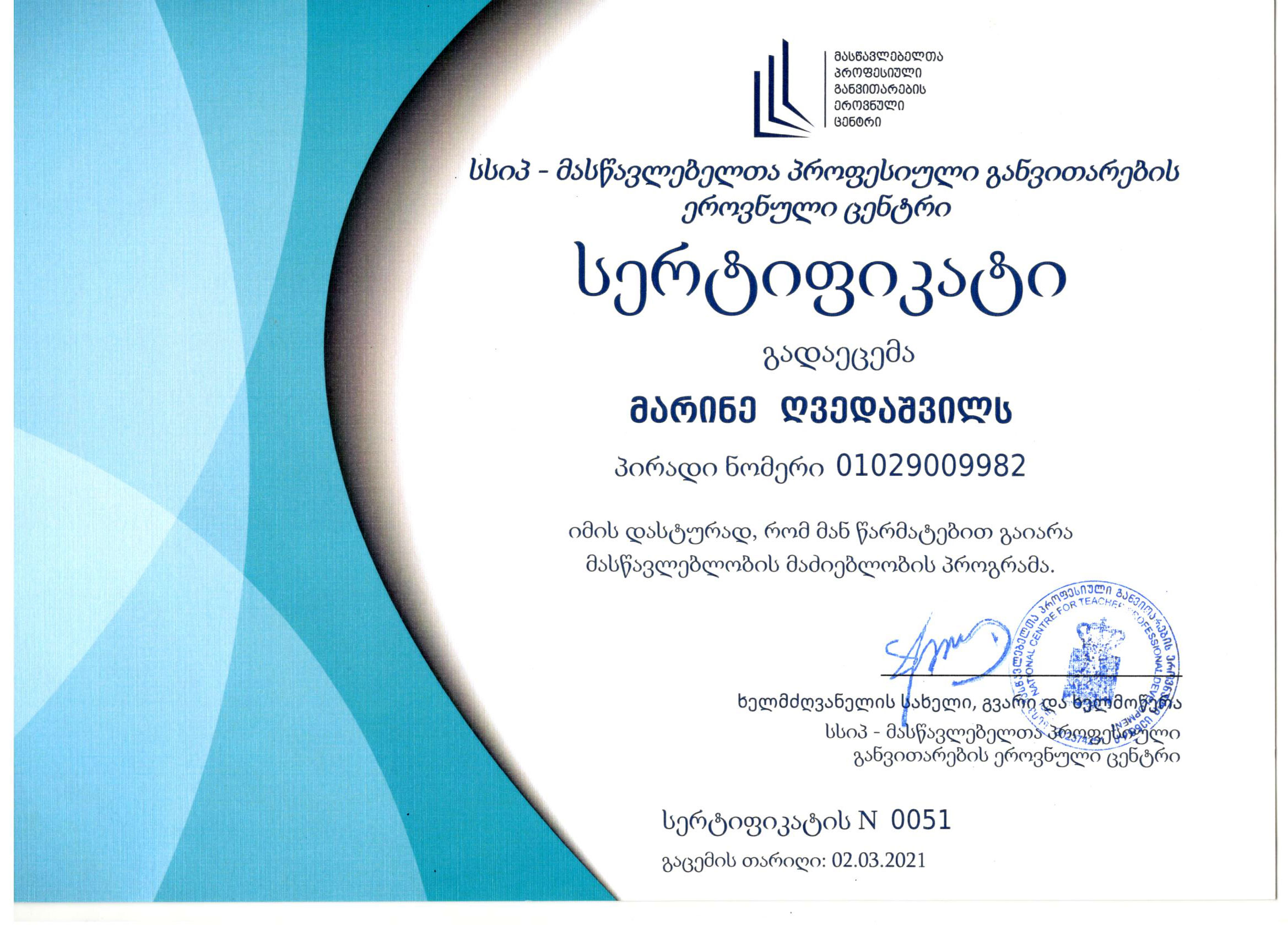 ვინაიდან დიპლომში მეწერა კვალიფიკაცია - მათემატიკოსი და არ მეწერა პედაგოგი, ამიტომ აუცილებელი იყო 60 კრედიტიანი პროგრამის გავლა, მაგრამ რადგან მოქმედი მასწავლებელი ვიყავი და ვასწავლიდი ერთერთ რეგიონში - გავიარე აკადემიური კურსი, რომელიც 2019 წლის დასაწყისიდან ამოქმედდა.