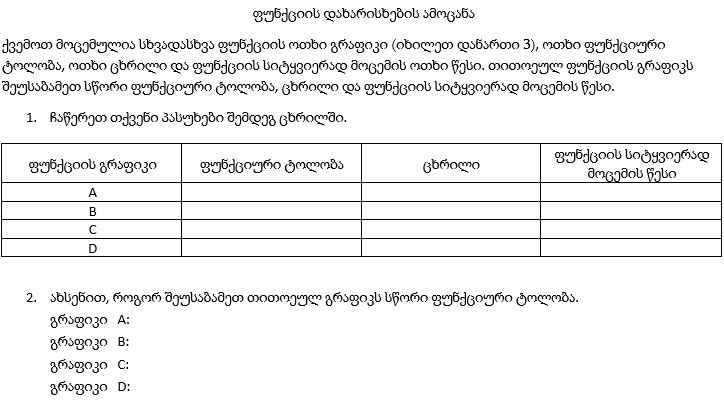 მოსწავლეებს მიეცემათ ამოცანა ფუნქციების დახარისხებაზე (დანართი 2), სადაც წარმოდგენილია ოთხი ფუნქციის გრაფიკი, ოთხი ფუნქცია, ოთხი ცხრილი და ოთხი განმარტება (დანართი 4); მოსწავლეებმა უნდა დაახარისხონ და დაალაგონ ფუნქციები სწორად შესაბამისობაში. წარედგინებათ ჯგუფებს დახარისხების ამოცანაში მოცემული ფუნქციებიდან უტოლობათა სისტემის შედგენის ოთხი ვარიანტი (დანართი 3). მოსწავლეებს ექნებათ არჩევის საშუალება რომელი ფუნქციებისგან უნდა შეადგინონ და ამოხსნან (ოთხი ვარიანტიდან ირჩევენ ერთს), როგორც განტოლებათა სისტემა, აგრეთვე გრაფიკულად უტოლობათა სისტემა.