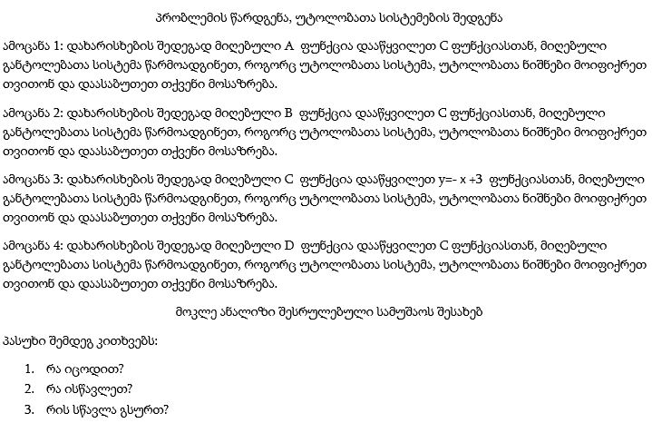 მოსწავლეებს გადაეცათ ფუნქციების დახარისხების ამოცანა, მისი გადაწყვეტის შემდეგ მოსწავლეები თვითონ ადგენებ ამოცანაში მოცემული ფუნქციებით განტოლებათა და უტოლობათა სისტემას (შემოთავაზებული ოთხი ვარიანტიდან ირჩევენ ერთს). შედგენილი განტოლებათა სისტემა ახალი მასალაა, მათ იციან ორუცნობიანი წრფივი განტოლებათა/ უტოლობათა სისტემა, მაგრამ არ იციან განტოლებათა და უტოლობათა ისეთი სისტემა, როცა ერთი განტოლება წრფივი განტოლებაა და მეორე კვადრატული განტოლება ან კვადრატულ განტოლებაზე დაიყვანება. თვითონ ანალიზის საფუძველზე ადგენებ უტოლობას, ანუ სვავენ უტოლობის ნიშნებს, ასაბუთებენ რატომ აირჩიეს ასე და არა პირიქით (არსებობს ამოცანის ამოხსნის რამდენიმე შესაძლებლობა).