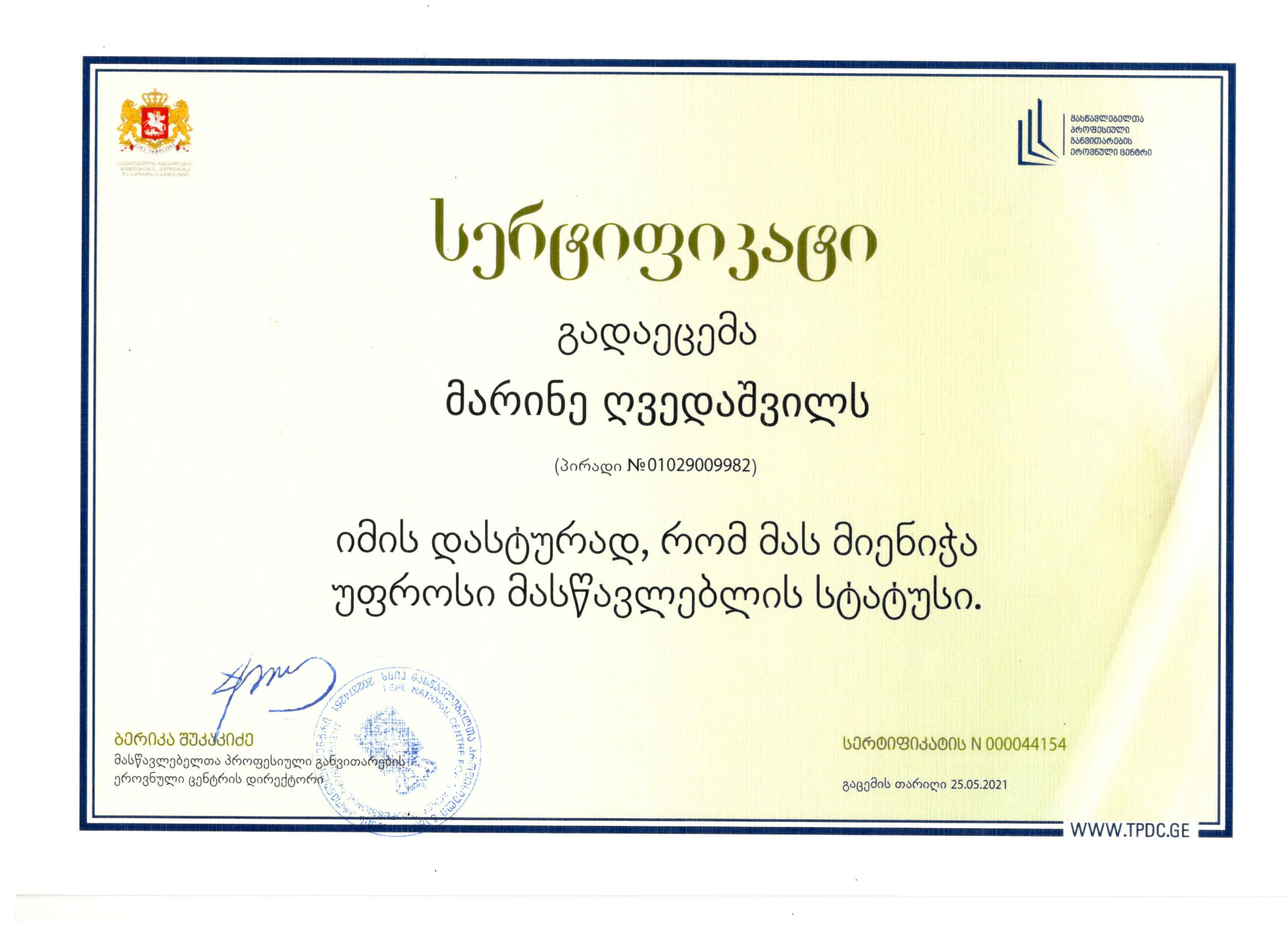 გავიარე აკადემიური კურსი და მომენიჭა 2020 წლის სექტემბერში უფროსი მასწავლებლის სტატუსი, თუმცა სერტიფიკატი ავიღე 2021 წლის 25 მაისს.