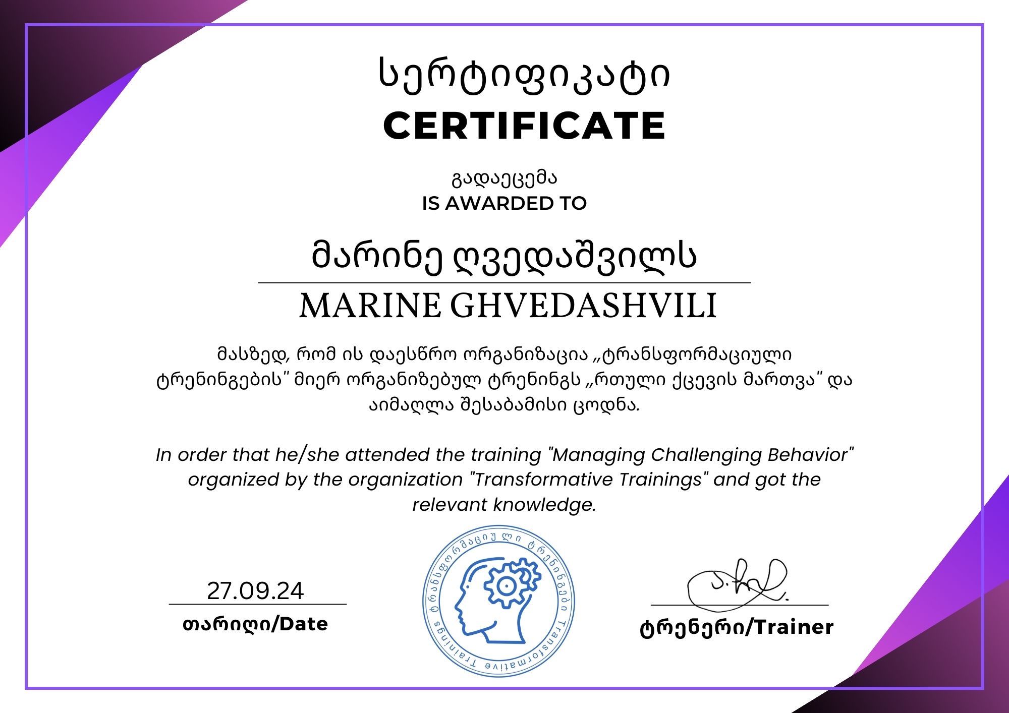 2024-2025 სასწავლო წლის დასაწყისშივე - 27 სექტემბერს, დავესწარი ტრანსფორმაციული ტრენინგების მიერ ორგანიზებულ ტრენინგს "რთული ქცევის მართვა".